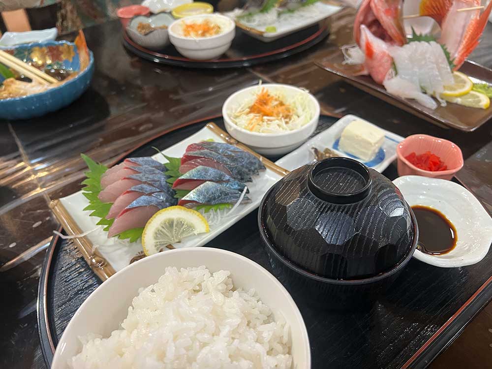二人で朝から動き回ってぺこぺこ。鯖のお刺身と、しめ鯖の定食を追加して二人で半分ずつにしました。