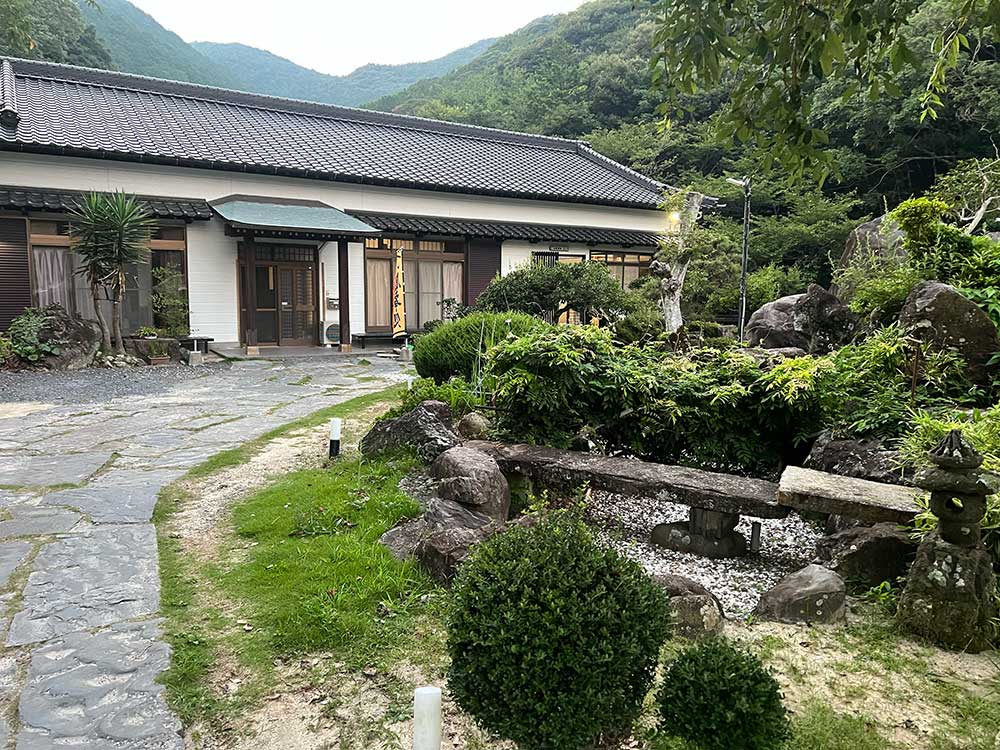 石垣と瓦屋根の看板が目印で、緑に囲まれた穏やかな雰囲気が印象的です。