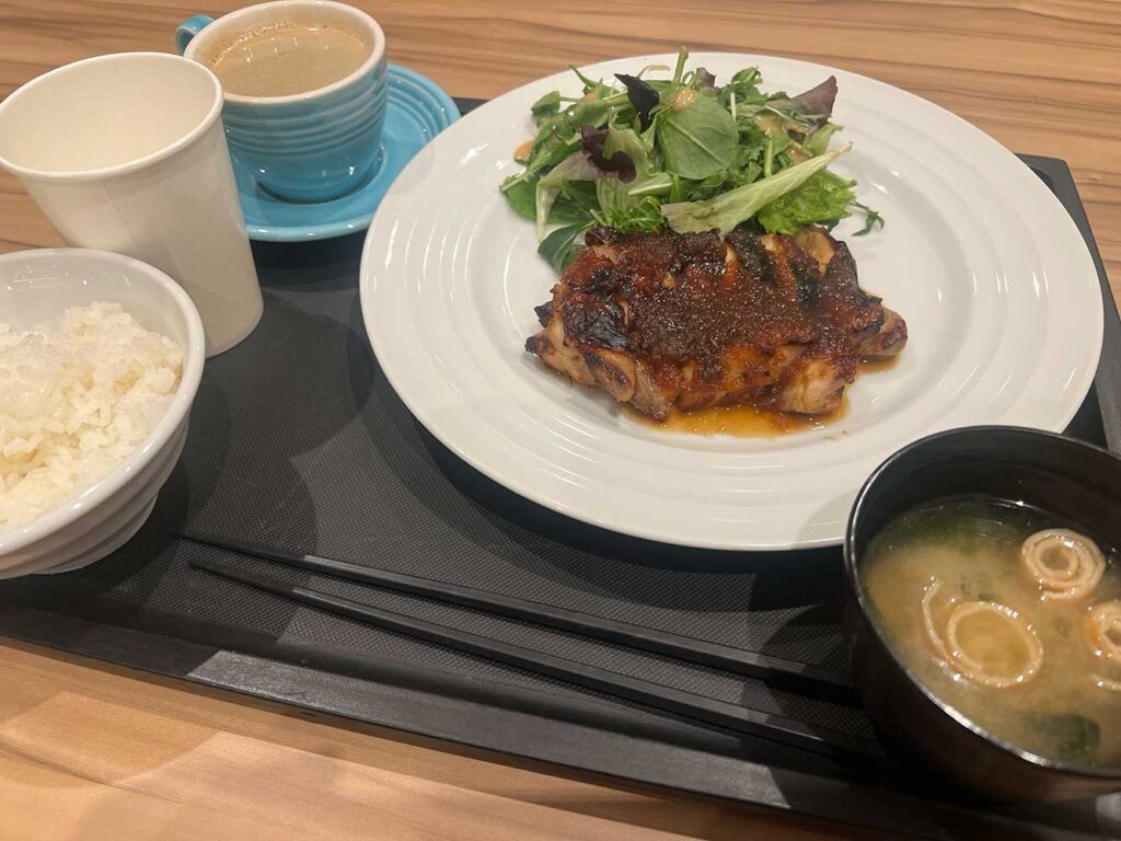 館内レストランでチキンソテー定食を注文。